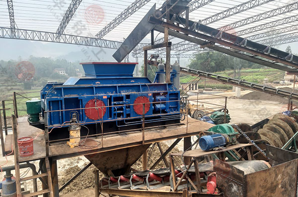 对辊破碎机通过辊轮进行破碎作业。物料由进料口进入辊子之间,通过挤压作用破碎河卵石,两辊轮之间有一定的间隙,两辊轮间隙变大,物料出料粒度变大,在压紧弹簧的作用下两辊轮间隙变小,出料粒度变小。通过改变调整间隙,可以控制物料的出料粒度。